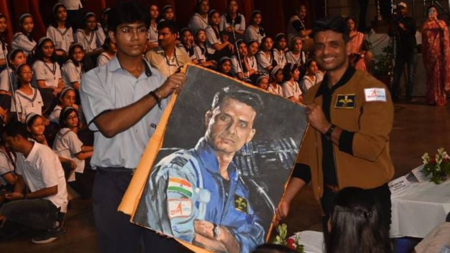 एक छात्र ने स्कूल के पुरातन छात्र रहे अंतरिक्ष यात्री शुभांशु शुक्ला को स्केच देकर उनका स्वागत किया।